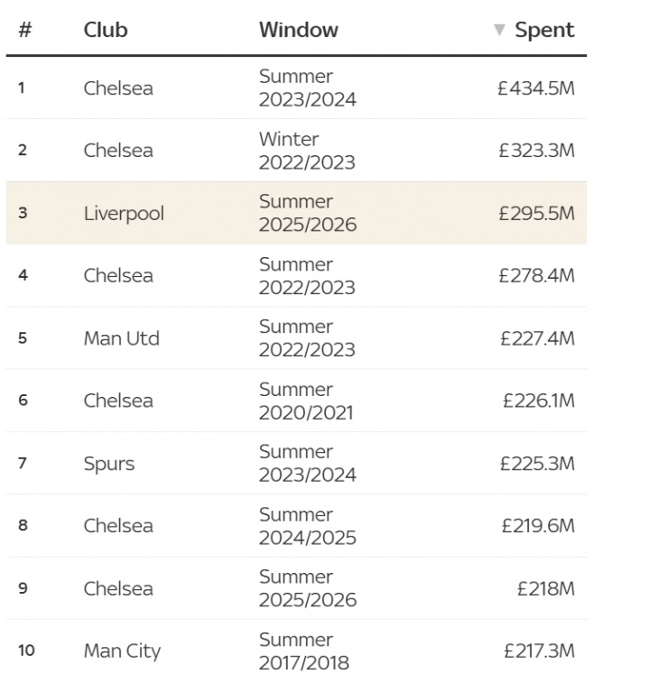 利物浦還花了2.95億英鎊在歷史上排名第三 而切爾西則以4.34億英鎊排名第一